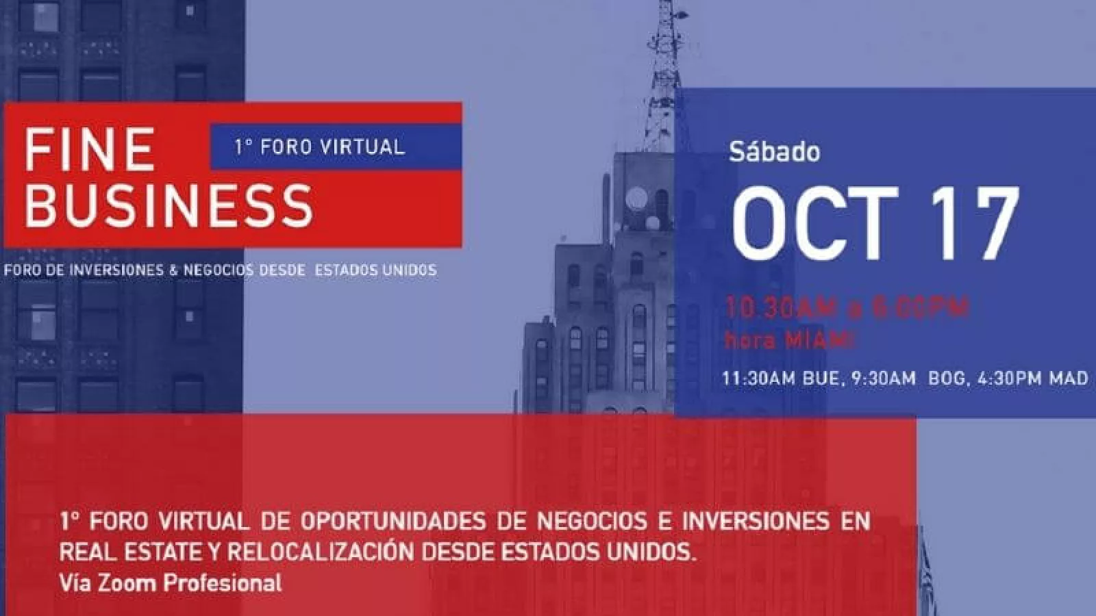 FINE BUSINESS FORUM 2020 es el 1° Foro Virtual de Oportunidades de Negocios e Inversiones en Real Estate y relocalización desde Estados Unidos. El evento será este sábado 17 de octubre de 11.30 a 19 (hora de Argentina).