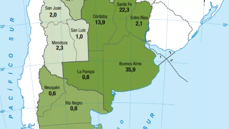 A la hora de generar los dólares que tanto demanda la economía argentina (para importaciones, pero sobre todo para pagar intereses y saciar el atesoramiento), tres provincias hacen casi ¾ del esfuerzo: Buenos Aires (35,9%), Santa Fe (22,3%) y Córdoba (13,9).