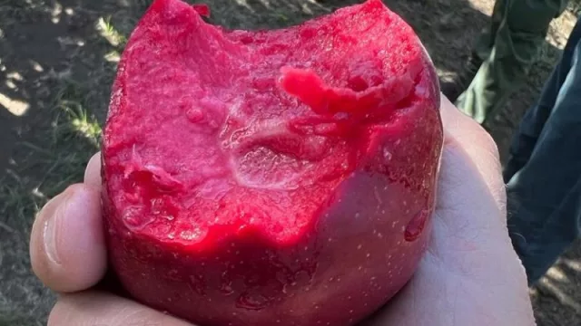 “La manzana de pulpa roja es un desarrollo, es un consorcio a nivel mundial que nosotros somos socios e invertimos en el desarrollo y también en la promoción. Es un trabajo de muchísimos años en los que se trajeron más de 60 selecciones de la variedad para ver cuál era la que mejor se adaptaba a nuestra zona. Esas plantas crecieron, se estabilizaron, ya tenemos las tres selecciones o clones definitivos que vamos a plantar de manera comercial… Ya hay varias plantadas y esperamos que los próximos dos años tengamos un primer volumen comercial, es interesante. Este consorcio es de Francia, Estados Unidos, Chile y de acá, somos solo nosotros. En el hemisferio Norte ya están las primeras manzanas a nivel comercial y están teniendo un éxito muy bueno”, agrega Nicolás.