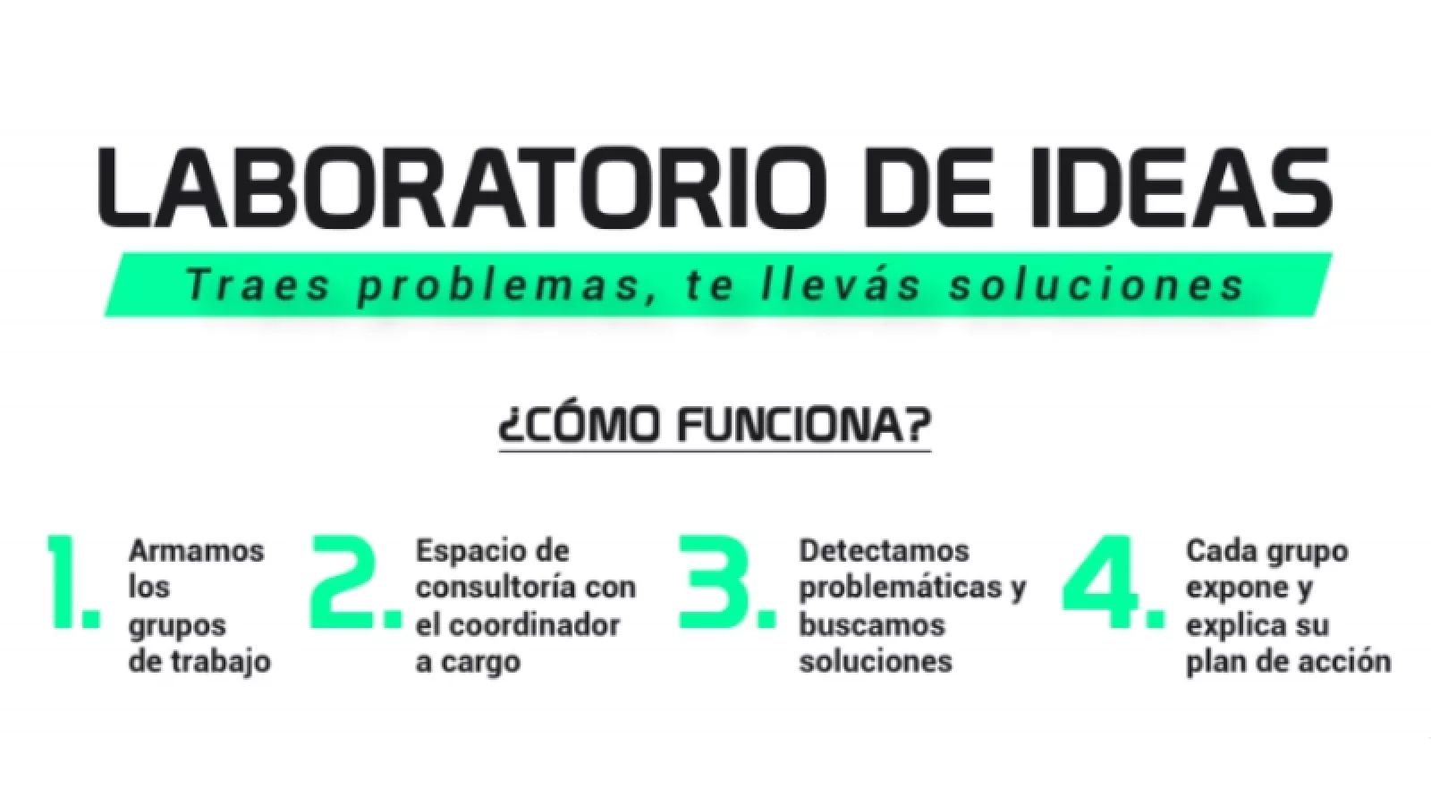 Todos los eventos de Mercado Fitness contarán -a modo de taller- con el Laboratorio de Ideas, que tiene su lema “Traés problemas, te llevás soluciones”, en donde se trabajará de la siguiente manera: