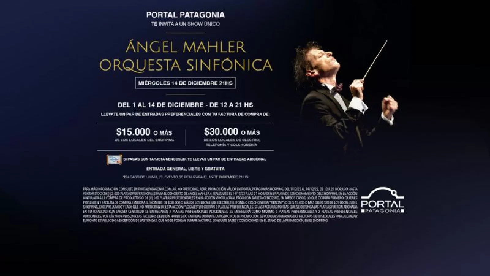 Para todos los clientes que quieran disfrutar del evento, Portal Patagonia brindará diferentes oportunidades para que puedan acceder a las entradas: aquellos que presenten sus facturas de compra de $15.000 o más, obtendrán dos entradas preferenciales (las facturas de audio, electro, computación, colchonería y telefonía participan desde $30.000 en adelante). Por otro lado, aquellos clientes que paguen la totalidad del ticket con Tarjeta Cencosud, obtendrán dos entradas adicionales.