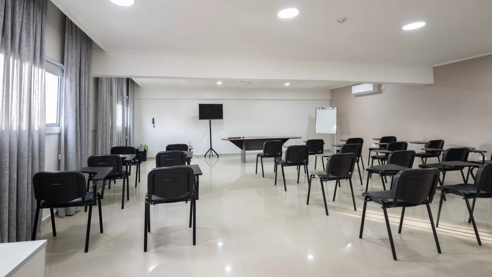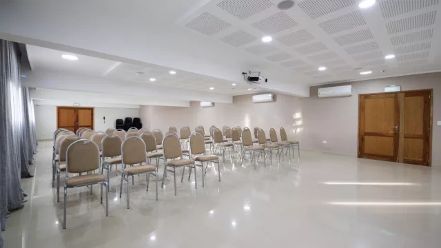 Además, el hotel cuenta con un salón más pequeño de 60m2, que también incluye un proyector y una pizarra. Este espacio es perfecto para reuniones más íntimas o sesiones de trabajo en grupo.