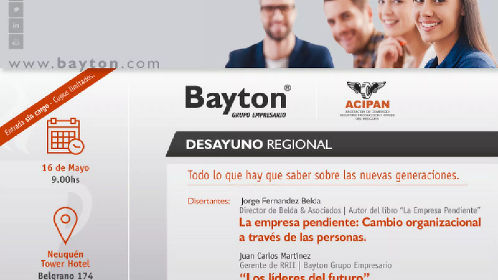 Bayton con este evento buscará relacionarse en un ambiente integrado por gerentes, jefes y directores de distintas áreas de empresas de la ciudad y de la región del Alto Valle, un imperdible encuentro que se desarrollará desde las 9 horas del miércoles 16 de mayo en el Hotel Tower (Belgrano 174) de la capital neuquina.