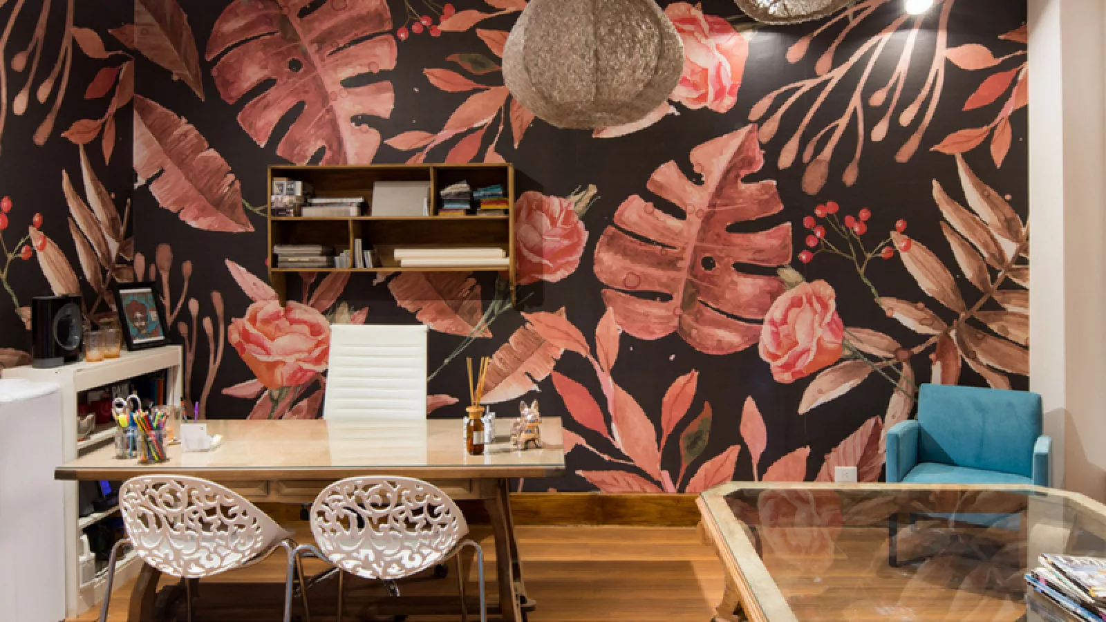 Su oficina es un precioso mural de flores, junto a esa ineludible combinación que provee la modernidad de dos computadoras y los muebles reciclados. A un lado se ve una paleta interminable de colores cuando se observa sobre una mesa ratona, es el “muestrario” de los variados diseños de sus empapelados que serán murales “de vanguardia” más grandes pero que ahora no son más que una hoja A3. Si bien parecen individuales (de esos que usamos para almorzar) no es así, son los claros ejemplos de cómo se pueden vestir diferentes ambientes y que a la vez, sea palpable la calidad de lo que pueda estar proyectando para ese cliente que la visita en el primer piso de la Galería Jardín.