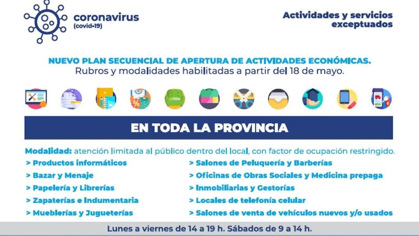 En esos primeros días anunciaba un “Plan Secuencial de Apertura de Actividades Económicas” definido en 3 etapas, comenzando aquel lunes 4 de mayo -primera etapa- habilitando a los comercios gastronómicos de toda la provincia a la modalidad “take away” y a los talleres mecánicos, casas de repuestos y venta de cubiertas atender por turnos.