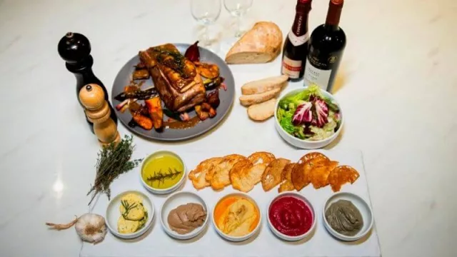 La propuesta es un variado tapeo que incluye tostadas de pan de masa madre y oliva, hummus tradicional de garbanzos, hummus de remolachas, un espectacular paté de ave, baba ganush y manteca con hierbas, para seguir luego con un bife de chorizo entero ahumado de más de 1.200 kg (en la caja para 4).