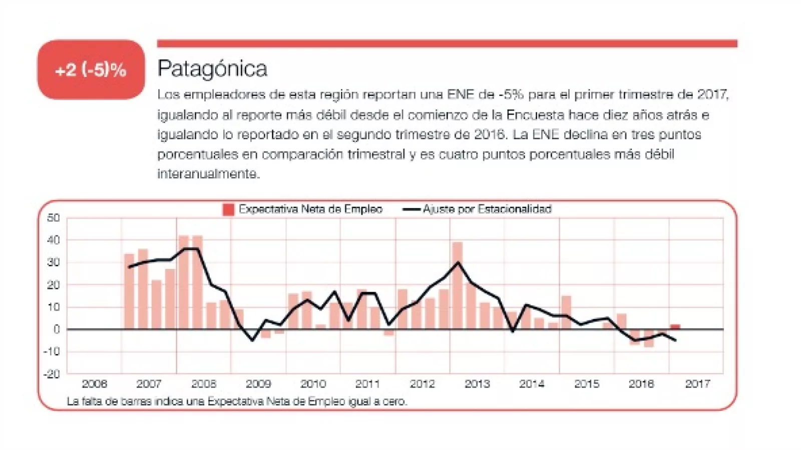 A nivel regional, los planes más optimistas son reportados por los empleadores de la zona pampeana, con una expectativa de +11%. En contraposición, Patagonia presenta la Expectativa Neta de Empleo (ENE) más baja, con un valor de -5%. La ENE se obtiene tomando el porcentaje de empleadores que prevé un aumento en sus contrataciones, restándole a éste el porcentaje que espera una disminución del empleo en su nómina para el próximo trimestre.