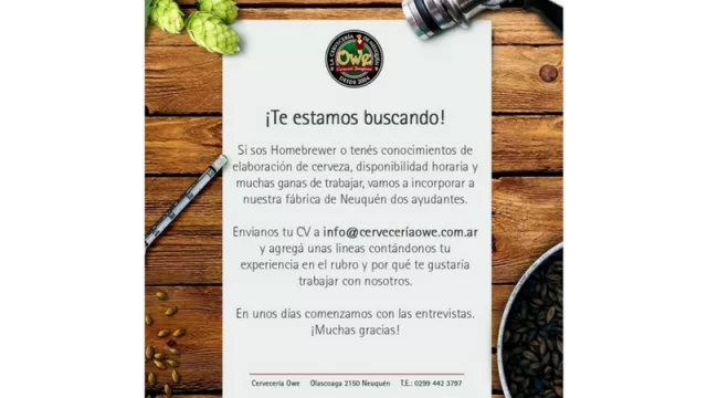 Un día antes de tamaño festejo, publicaron una búsqueda laboral que consiste en la posibilidad de ingresar al plantel de su fábrica a dos personas, “homebrewer”, o bien a cualquier persona que tenga conocimientos sobre la elaboración de cervezas artesanales, “disponibilidad horaria y muchas ganas de trabajar”, condiciones para la incorporación de ambos ayudantes.