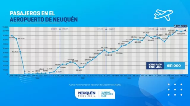 El aeropuerto de Neuquén capital también tuvo un gran julio: 102.000 pasajeros, un 25% más que el mismo mes del año pasado, llevando el acumulado enero-julio de 2023 a 651.000 pasajeros, un 46% más que el mismo lapso de 2022.