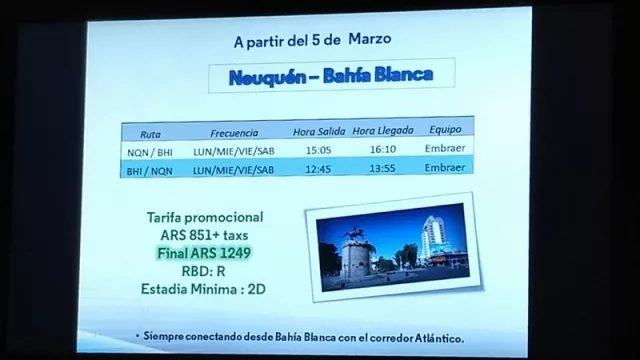 Aerolíneas Argentinas regresa con el vuelo Neuquén–Bahía Blanca, con tarifa promocional de 1.249 pesos (y de allí a Mar del Plata por 1.700 pesos), con cuatro frecuencias semanales: lunes, miércoles, viernes y sábados. Saldrá de Bahía Blanca a las 12.45 y llegará a Neuquén a las 13.55; mientras que desde Neuquén saldrá a las 15.05 y llegará a Bahía Blanca a las 16.10 hs.