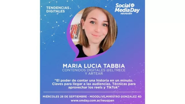Como parte de la grilla de Speakers del Social Media Day Neuquén 2022, contará su experiencia María Lucia Tabbia, contenidos digitales de @ElTrece Y Artear. "El poder de contar una historia en un minuto. Claves para llegar a las audiencias. Técnicas para aprovechar los reels y TikTok" éste será el eje principal de la charla que además comentará sobre la oportunidad que representan los videos cortos en todas las redes sociales, “la idea es brindar recomendaciones que pueden llegara funcionar” teniendo en cuenta la experiencia personal y profesional, a su vez lo que puede rendir en este tipo de contenidos.