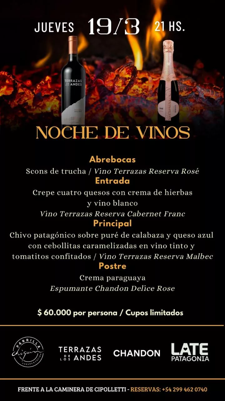 El próximo jueves 19 de marzo a las 21 horas se realizará una nueva edición de “Noche de Vinos”, una propuesta gastronómica que combinará cocina patagónica y maridaje de vinos en un formato de cena por pasos. El encuentro tendrá lugar en Chiquín Fuegos y Cocina, frente a la caminera de Cipolletti, y es organizado por Late Patagonia.