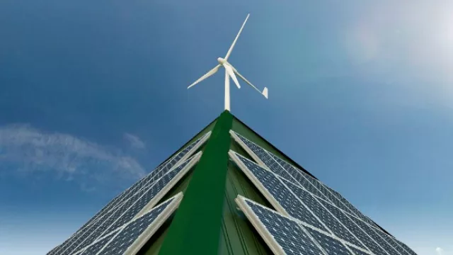 Tiene paneles solares ubicados en 1, 2 o 3 caras de la pirámide, dependiendo de la energía que se quiera producir, complementado con un aerogenerador eólico en la cumbre del techo. También tiene un termo tanque solar para calentar el agua de uso doméstico y calefaccionar la casa con radiadores o losa radiante.
