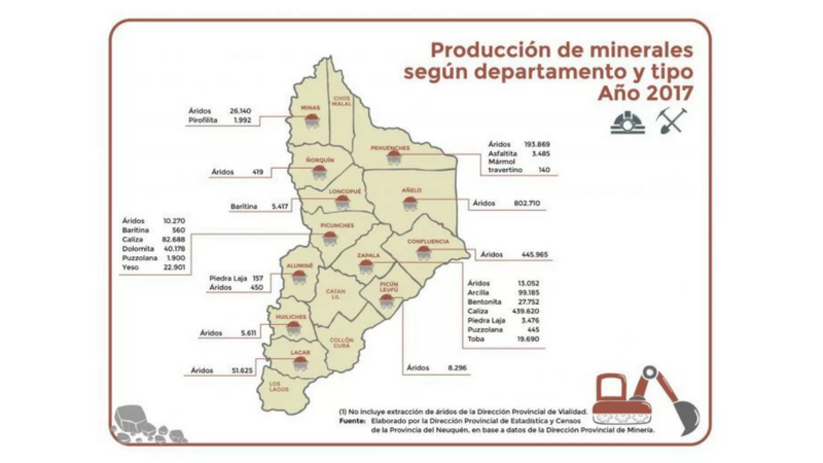 En la provincia de Neuquén durante el 2017 existieron 136 yacimientos activos, un 15% más respecto del 2016. Según las estadísticas difundidas los yacimientos que extraen áridos son los que se posicionan en su mayoría, por su participación en los procesos iniciales de la construcción de plateas, caminos y ductos.
