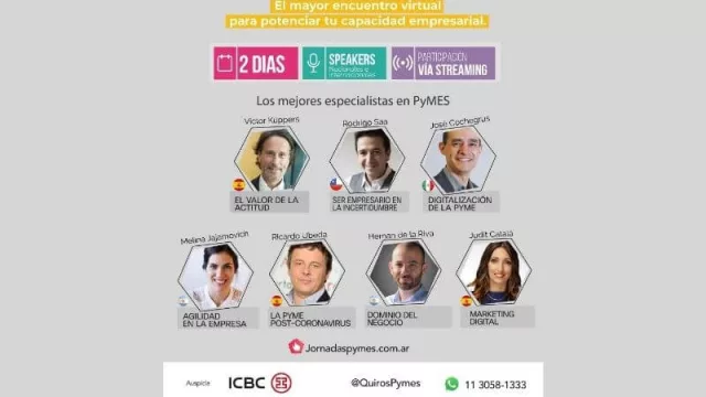 El evento abordará temas como Entorno Cambiante con Jesús Cochegrus (México), Agilidad en la empresa con Melina Jajamovich (Argentina), Dominio del negocio con Hernan de la Riva (Argentina), La PyME después del Coronavirus con Ricardo Úbeda (España), Conanza con Rodrigo Saá (Chile), Marketing digital con Judit Catalá (España) y El poder de la actitud con Victor Küppers (España).