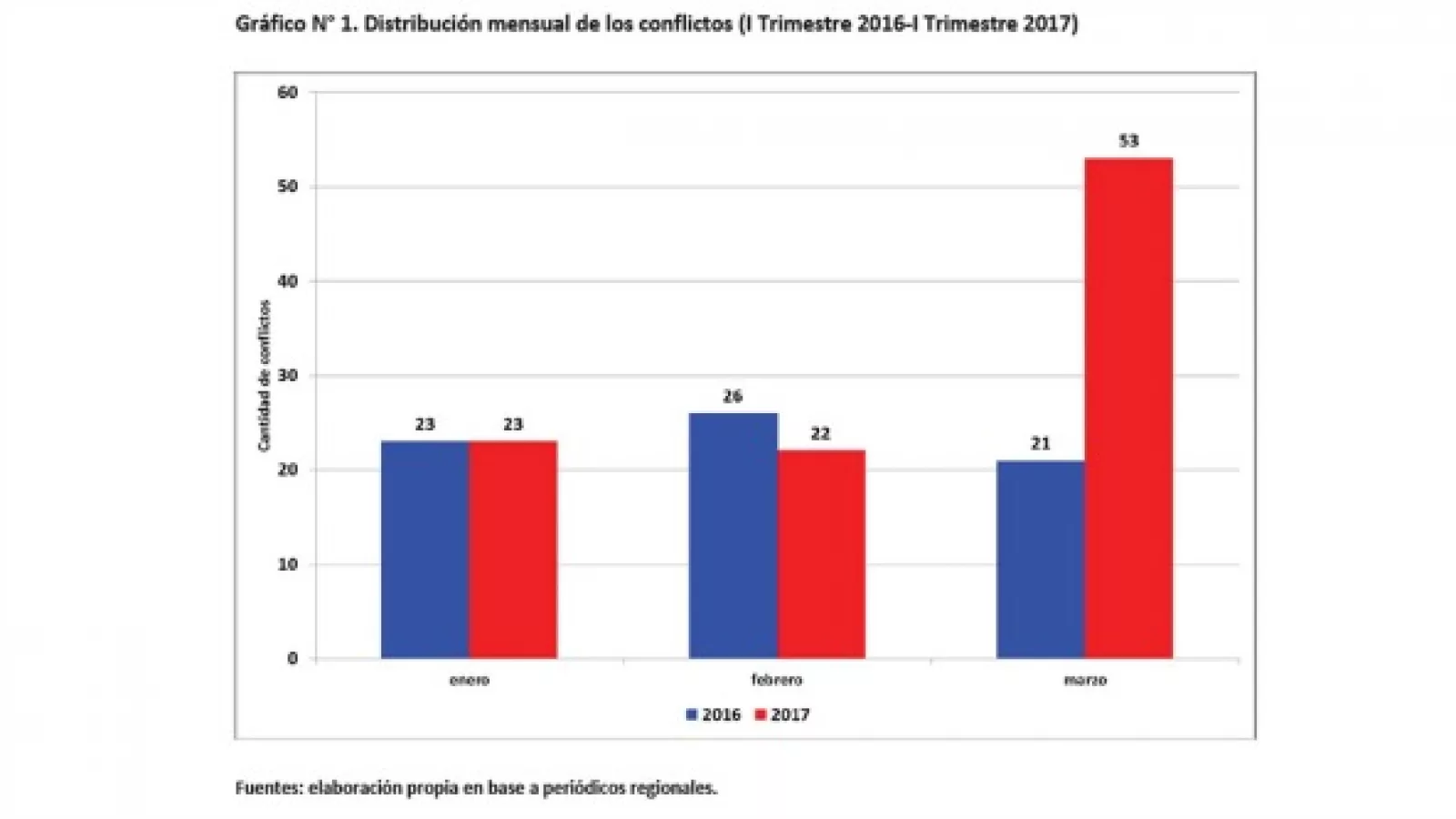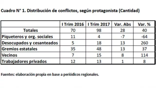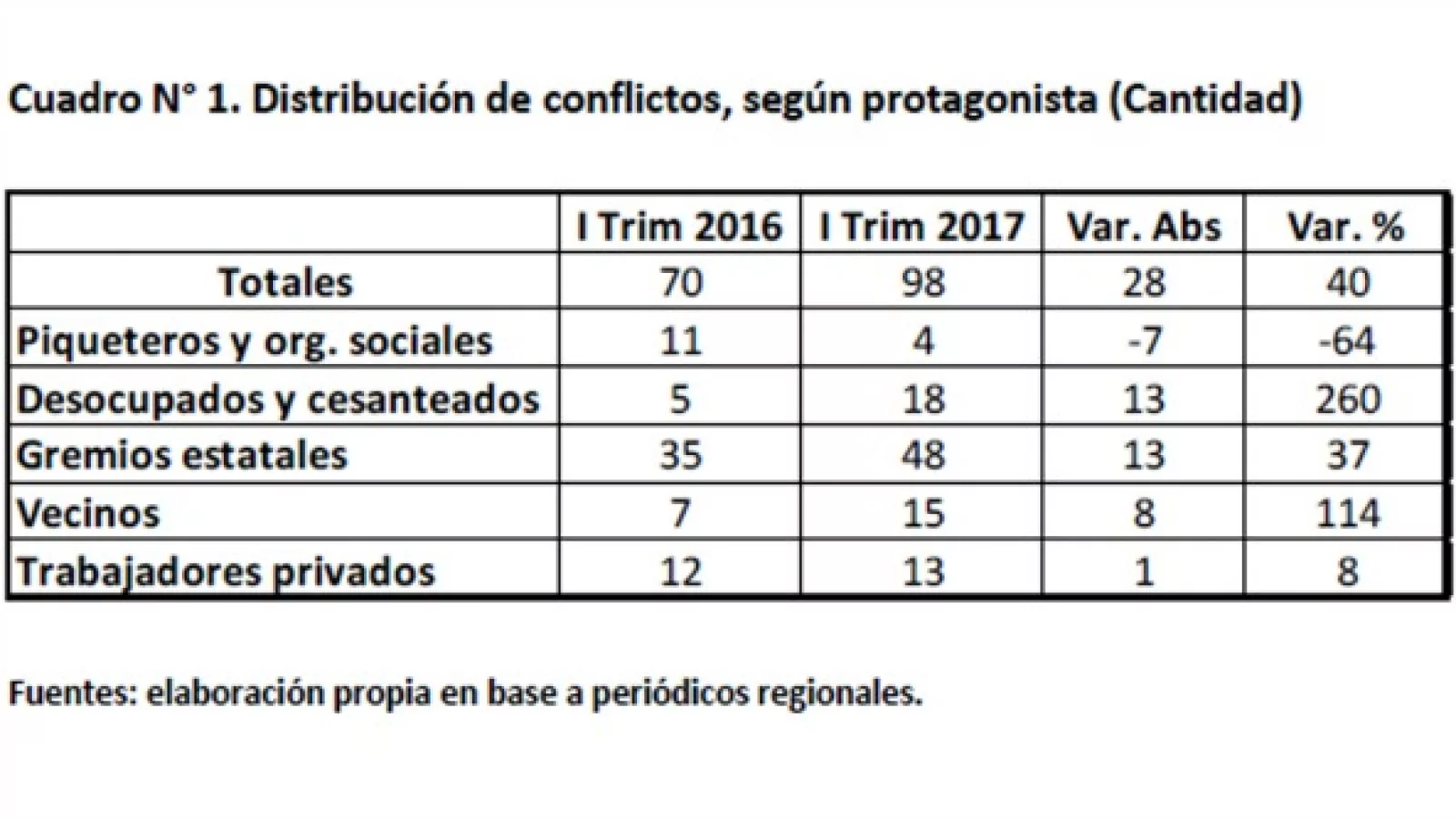 Santa Cruz, Neuquén (segunda en el orden), junto a las restantes provincias patagónicas se ubican en los primeros diez lugares. El mes de mayor conflictividad del primer trimestre fue Marzo, con el 54%.
