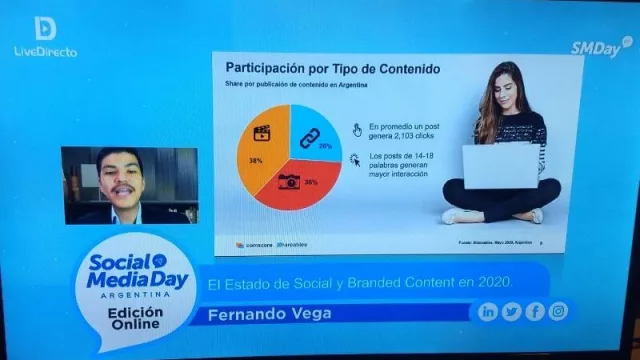 El primer speaker fue Fernando Vega, Social Manager de Comscore para América Latina, quien habló de "El Estado de Social y Branded Content en 2020". Y empezamos con los datos “duros” que sirven para tomar decisiones, y sobre todo en el consumo de redes sociales en la Argentina. Dijo que “de febrero a marzo del 2020 se incrementó un 23% el volumen de publicación diaria en propiedades –cuentas- de Argentina”, pasando de unas 18.398 a 22.471 publicaciones.