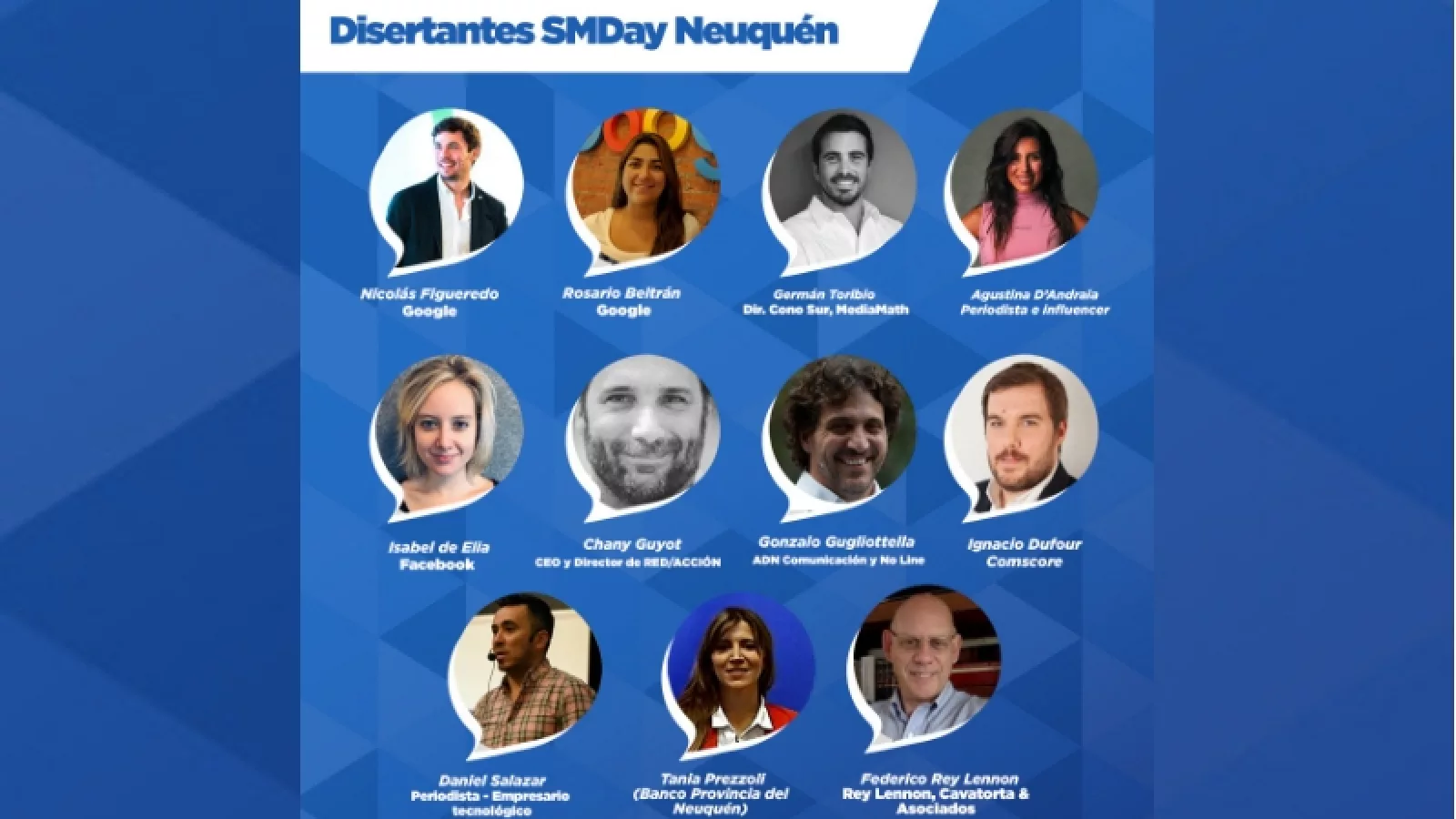 A esta lista se sumaron tres personalidades más a último momento. El periodista y empresario tecnológico Daniel Salazar hablará sobre “Periodismo desde el aire”, con la mira puesta en explicar cómo se usan los drones en el periodismo de la actualidad; Tania Prezzoli del Banco Provincia de Neuquén expondrá con una disertación sobre “El desafío de la transformación digital”; y Germán Toribio (el director de Cono Sur, MediaMath) dará una charla sobre denominada “¿La tecnología eliminará el talento humano en los equipos de marketing?”.