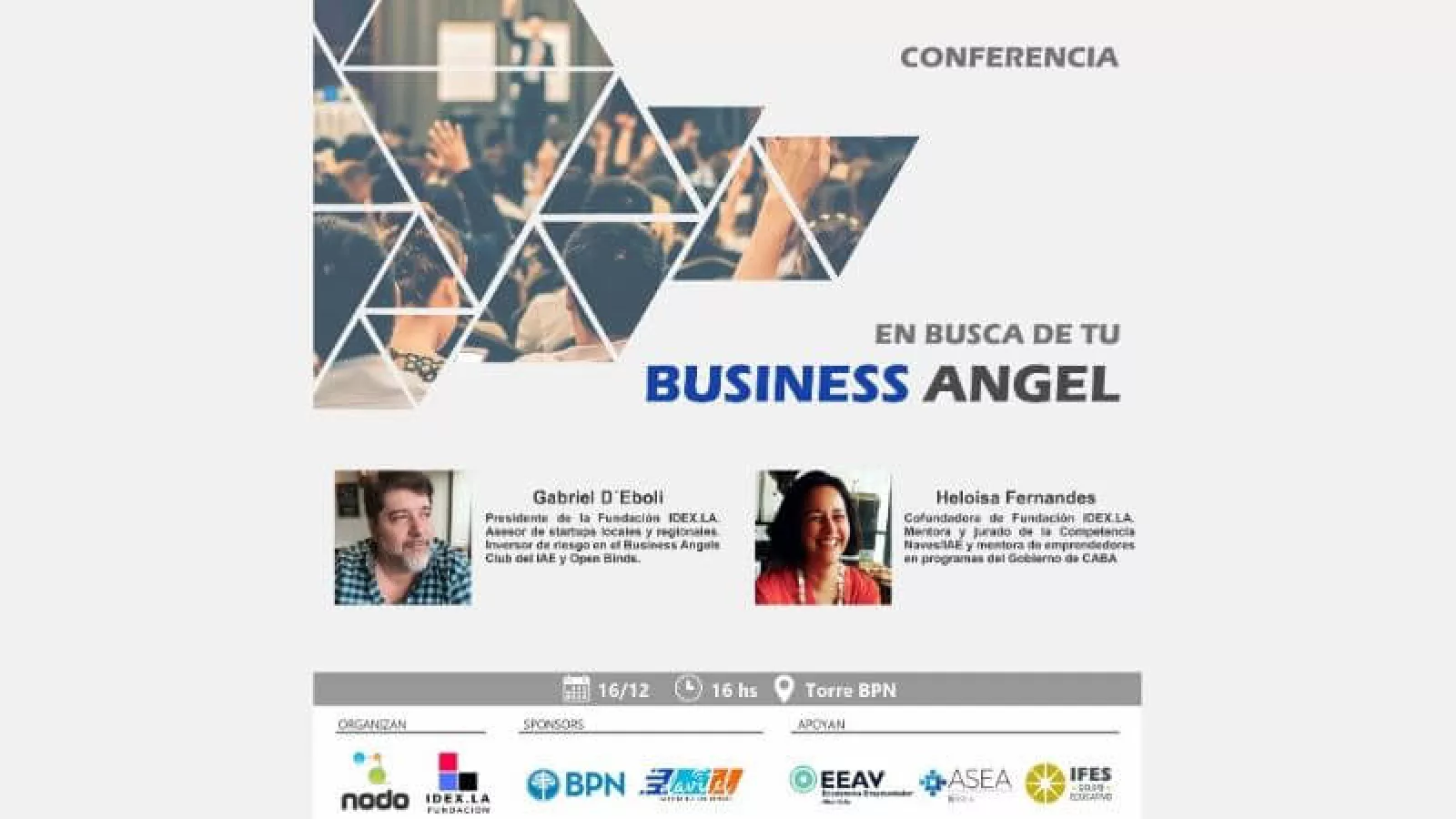 “Los inversores ángeles son personas que invierten su dinero en la fase inicial de compañías emergentes a cambio de una participación en el capital. Pudiendo hacerlo tanto directamente como a través de un club de inversores”, explica Andrés Tejeda organizador de la conferencia que unirá las experiencias de Gabriel D´Eboli y Heloisa Fernandes, dos referentes en el tema (ver acá).