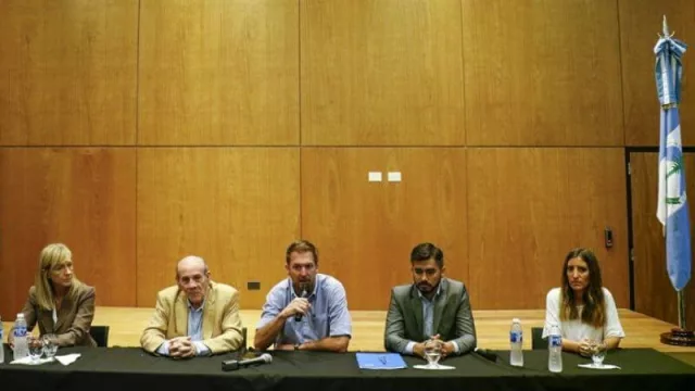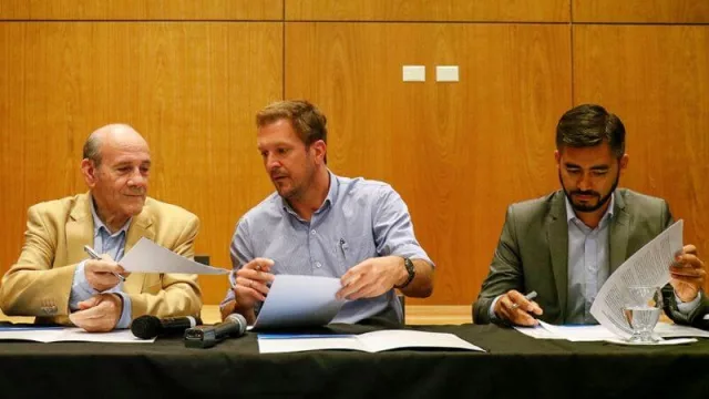 El presidente del Banco Provincia del Neuquén, Alejandro Visentin, el ministro de Producción e Industria, Facundo López Raggi y el vicepresidente del Centro Pyme-Adeneu, Edgardo Phielipp, firmaron el convenio con el objetivo de brindar capacitaciones a pequeñas y medianas empresas de la provincia del Neuquén.