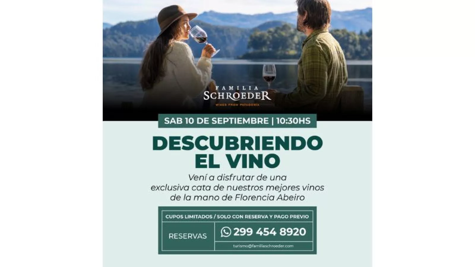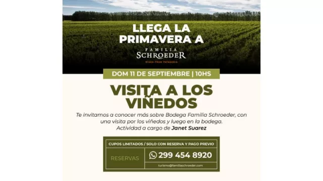 Para el domingo 11 de septiembre se realizará una visita a los viñedos. Desde Familia Schroeder se está invitando a conocer más sobre la Bodega, con una visita por los viñedos y luego en la bodega. La actividad comienza a las 10 hs. y tiene un valor por persona de $ 2.400. Para aquellas personas que participen, el precio incluye una gorra de regalo y una botella de agua. Desde la bodega se solicita que se traiga calzado, ropa cómoda y protector solar. También deben asegurar su cupo ya que es limitado la cantidad de visitantes que pueden realizar el recorrido.