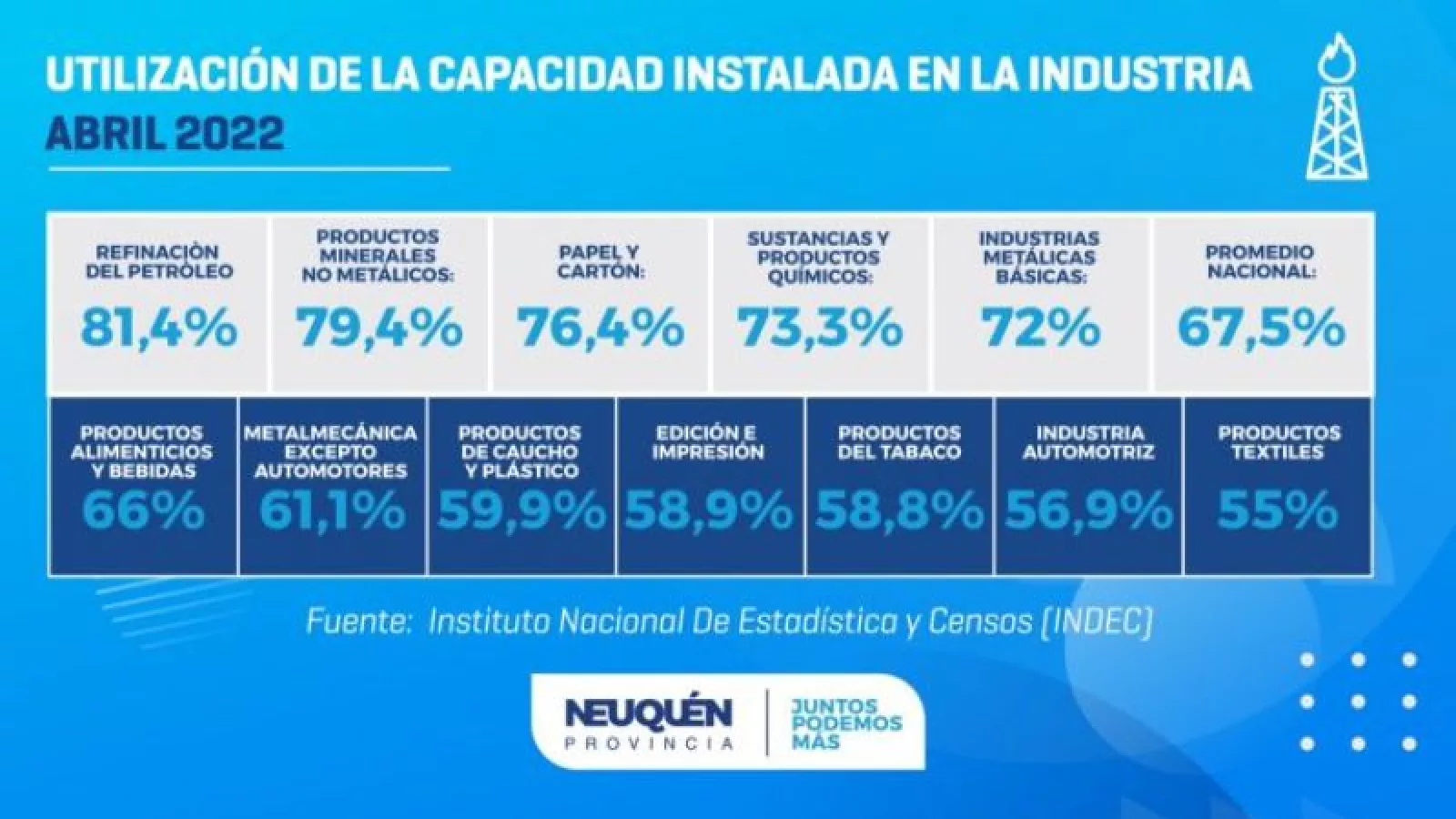 Debido a la mayor extracción de crudo y la incidencia de la formación neuquina Vaca Muerta, la refinación de petróleo alcanzó un 81,4 % de nivel de utilización de la capacidad instalada, 8,3 puntos más que en abril del año pasado, cuando ese indicador registró 73,1 %.