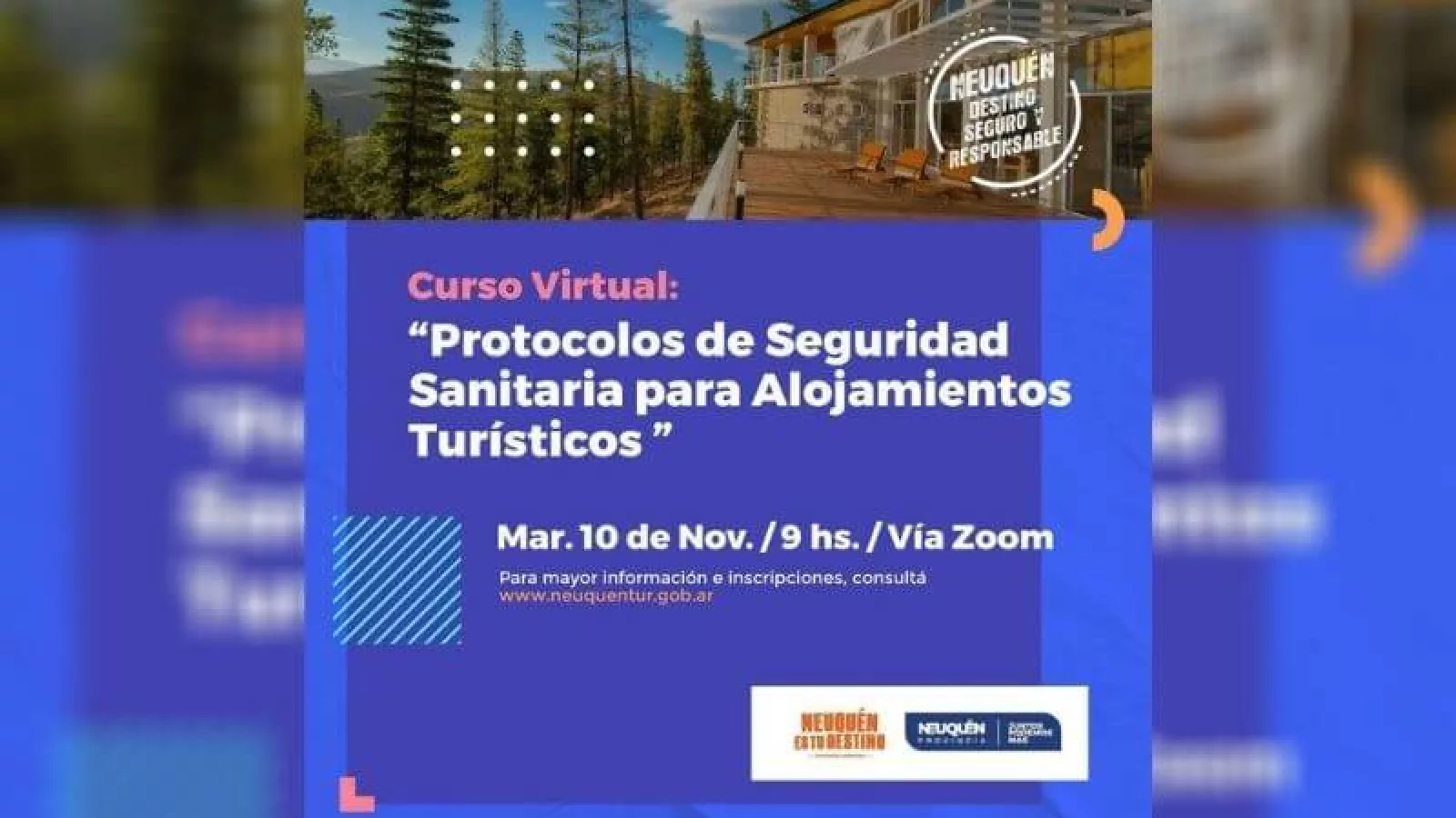 A través del Ciclo de Cursos Virtuales en Protocolos de Seguridad Sanitaria para el Sector Turístico de la Provincia del Neuquén y bajo el lema, “Neuquén Destino Seguro y Responsable”, se dictará este martes 10 de noviembre a las 9 vía Zoom, un nuevo curso virtual, coordinado desde el Ministerio de Turismo.