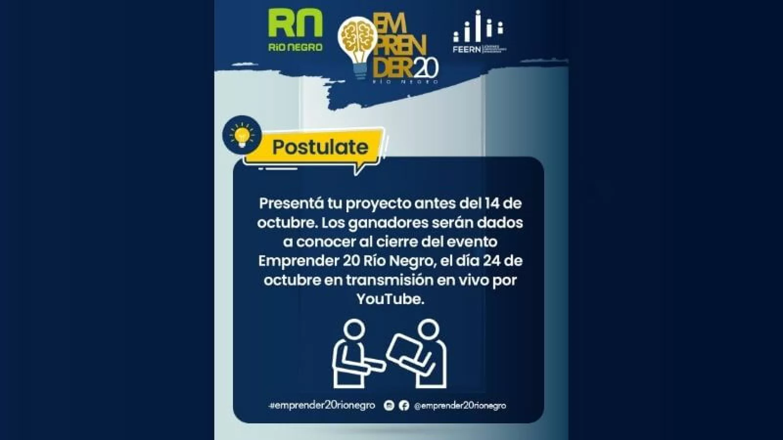 Llega desde este martes 20 hasta el sábado 24 de octubre el Emprender 20 Río Negro de la mano de la Federación de Entidades Empresarias de Rio Negro (FEERN) y con el apoyo de la Secretaría de Cultura de la Provincia. Un evento que convoca a jóvenes entre 18 y 40 años con vocación emprendedora que posean o no una empresa constituida en la provincia de Río Negro. Será 100% online y gratuito y ofrecerá capacitaciones de expositores de nivel y testimonios de emprendedores de la zona.