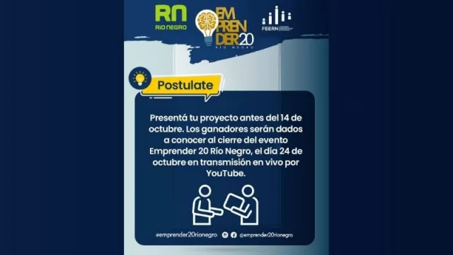 Además, como parte de esta 5° Edición del Emprender Río Negro, se obsequiará el Premio Joven Emprendedor Rionegrino que galardonará a tres proyectos, ideas o emprendimientos en marcha que destaquen por su nivel de desarrollo, innovación tecnológica o solución propuesta. Un jurado compuesto por tres autoridades del sector público y tres del sector privado definirá a los ganadores de los $ 300.000, $ 200.000 y $ 100.000, para el primero, segundo y tercer puesto respectivamente. Los interesados en la postulación podrán enviar sus proyectos y pedir Bases y Condiciones aquí e inscribirse hasta el 18 de octubre.