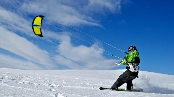 El snowkite es un deporte innovador que fusiona el kiteboarding con el snowboard o el ski. La fuerza del viento permite a los practicantes hacer cosas jamás pensadas en la montaña, como subir cuesta arriba, animarse a saltos increíbles, recorrer grandes distancias en excursiones y flotar sobre la nieve son algunas de las emociones.