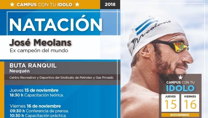 Los días jueves 15 y viernes 16 de noviembre visitarán la localidad del norte neuquino, allí el mejor nadador argentino de todos los tiempos, Meolans, disertará en una nueva edición del programa “Campus con tu ídolo”. Se trata de un trabajo en conjunto realizado por la Fundación Conygriega y el Municipio de Buta Ranquil.