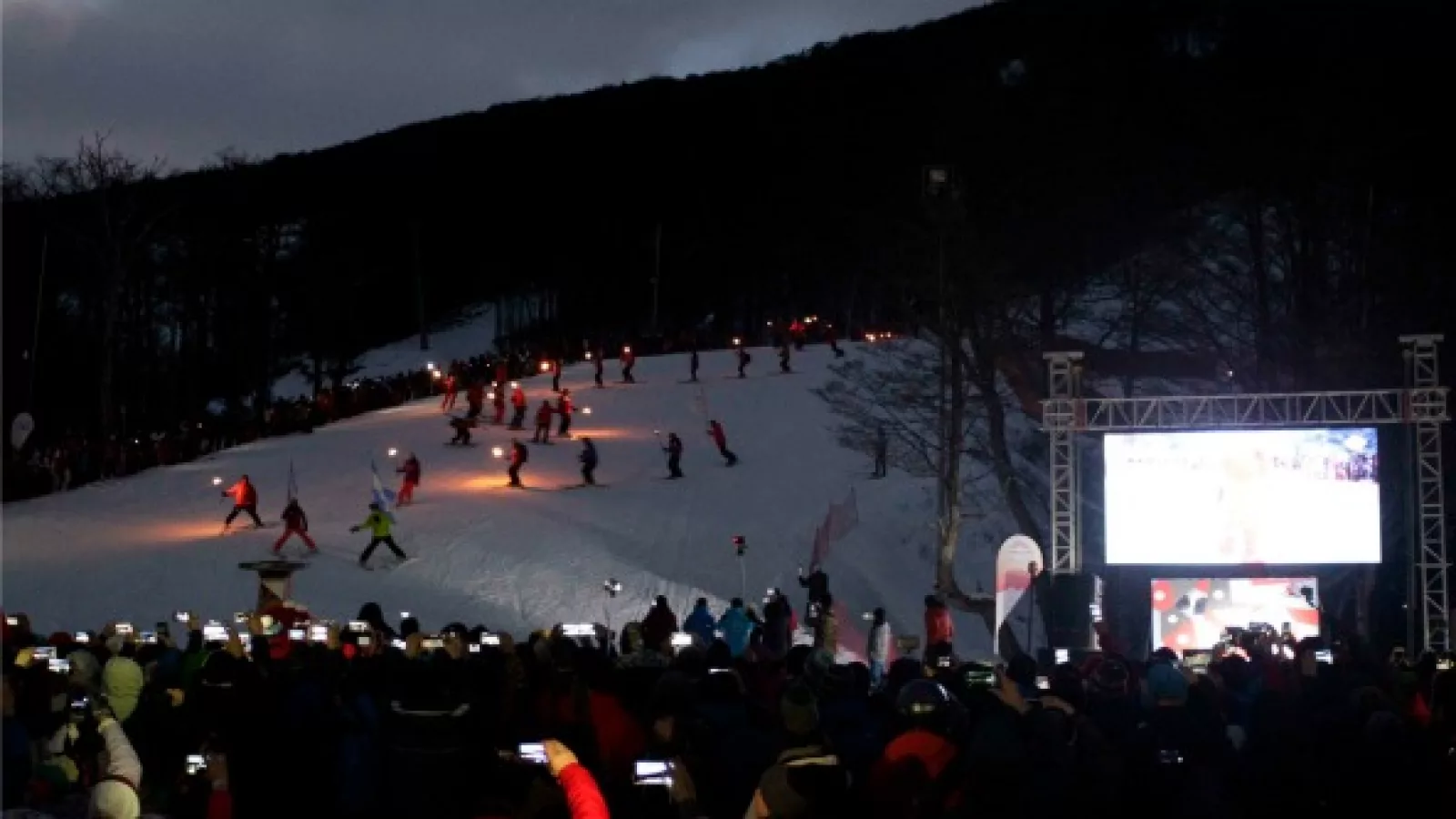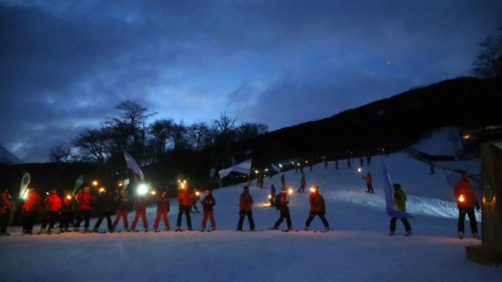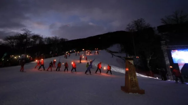 La “Bajada de Antorchas” congregó a instructores de esquí de la Escuela de Esquí Cerro Castor y el Club Andino. Todos ellos bajaron por la pista El Cóndor hasta la base, siendo Antonio Wallner (uno de los fundadores del Club Andino Ushuaia) el encargado de encender la llama que simboliza la unión de Tierra del Fuego.