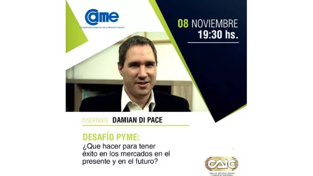 El 8 de noviembre, a partir de las 18,30 horas, Di Pace hablará en un espacio organizado con la CAIC y la CAME de las nuevas generaciones de consumidores y readaptación del consumo actual, sobre inteligencia comercial y las claves de la innovación en los negocios para las Pymes.