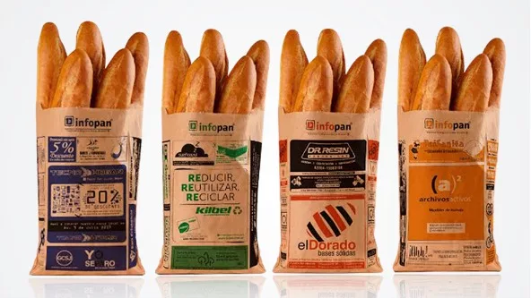 Foco: distribución de bolsas de papel reciclado, impresas con publicidad de los comercios de la zona, en la red de panaderías en todo el país.