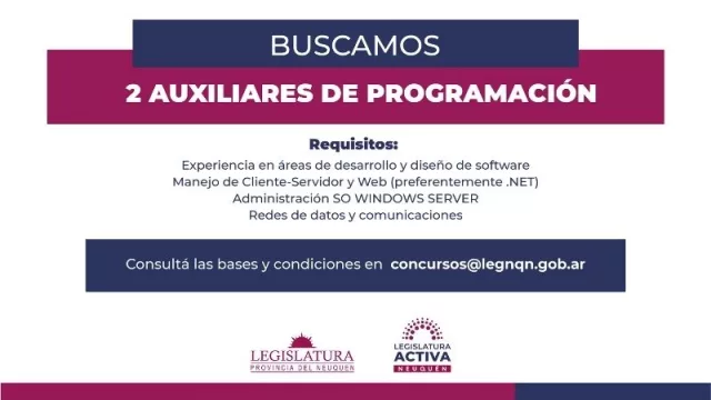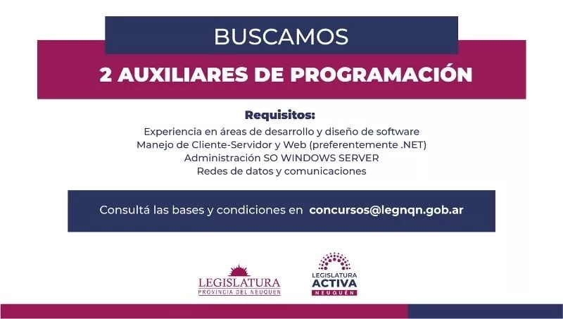 Desde la Legislatura de Neuquén están buscando dos Auxiliares de Programación para desempeñarse en la Dirección de Tecnologías Informáticas de la institución. Quien ejerza el puesto, deberá poder determinar los objetivos de los programas y fuentes de datos; codificar, compilar, probar y/o modificar programas de uso en la Legislatura; como así también desarrollar sistemas nuevos y/o modificación/corrección de los existentes, entre otras tareas.