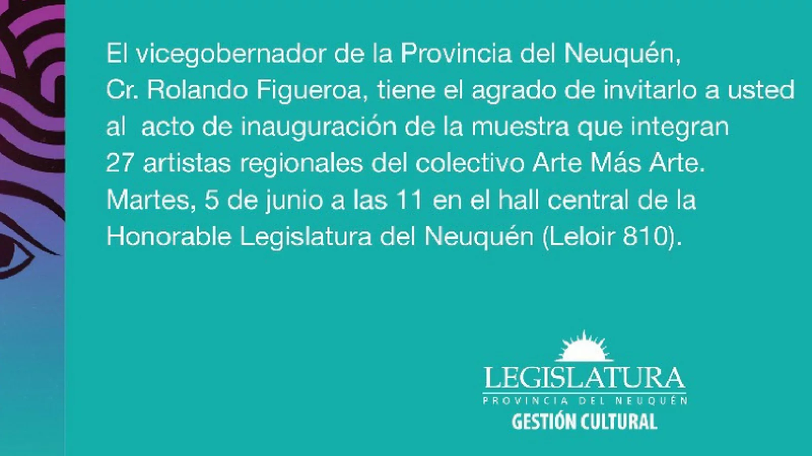 La Honorable Legislatura del Neuquén, en el marco de su Programa de Extensión Cultural y Comunitaria, presenta una nueva muestra colectiva de artistas plásticos regionales. La convocatoria, que surge desde la Dirección de Gestión Cultural a cargo de Oscar Sarhán, es abierta a todo público y se realizará en el Hall central del edificio, ubicado en Leloir 810 de la capital neuquina.