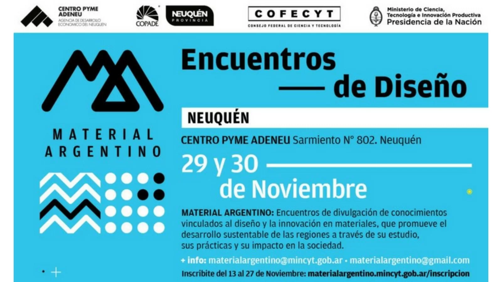 Material Argentino es el encuentro de diseño organizado por el Consejo Federal de Ciencia y Tecnología (Cofecyt) en conjunto con el gobierno de la provincia del Neuquén, a través de la secretaría de Planificación y Acción para el Desarrollo-COPADE y el Centro PyME-Adeneu.