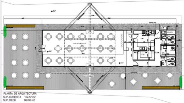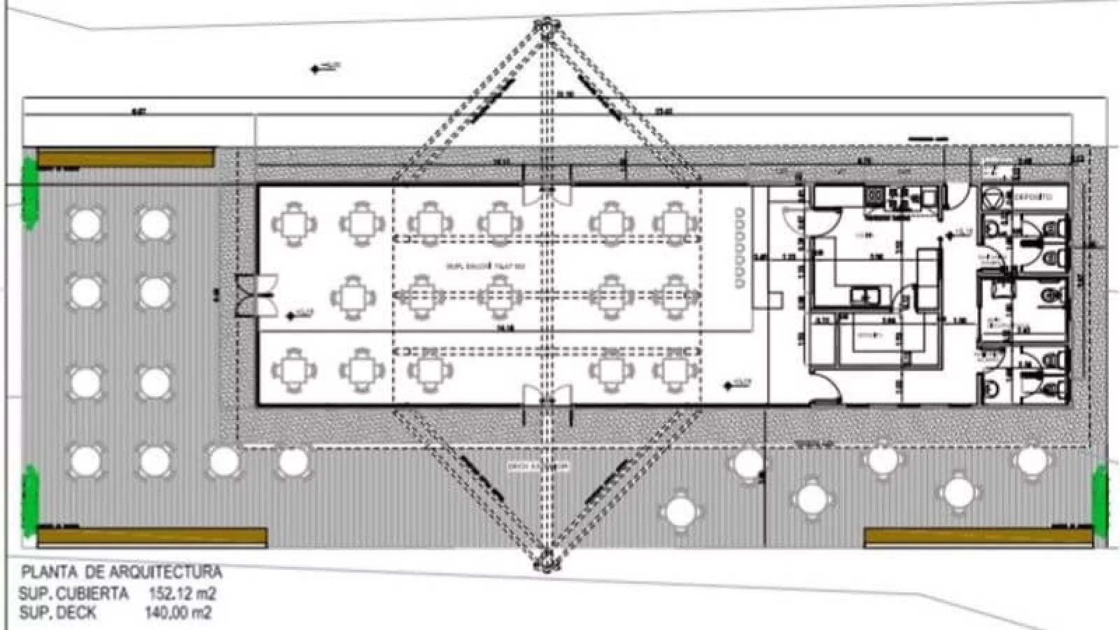 El establecimiento gastronómico tendrá una superficie total cubierta de 150 m2, compuesto por un salón de 100 m2, y un deck exterior de 150 m2. El establecimiento contará con un sector de sanitarios, baños para personas con discapacidad y una cocina con depósito.