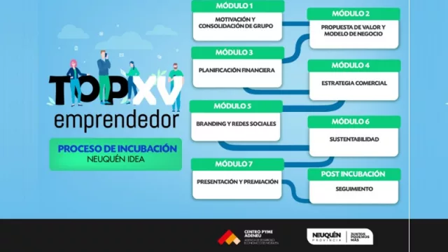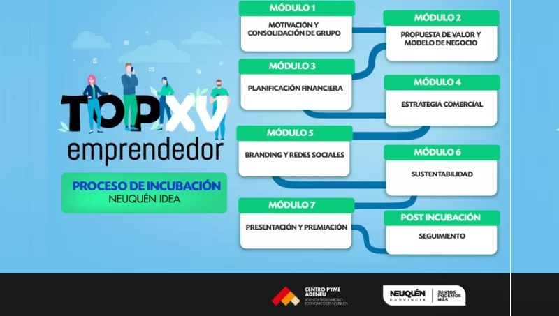 El gobierno provincial, a través de Centro PyME-Adeneu convoca a emprendedores neuquinos a participar de un proceso de incubación denominado “Top XV Emprendedor” (ver acá). Allí y en unos 8 meses se trabajará sobre modelo de negocio, planificación financiera, estrategia comercial y redes sociales, entre otros ejes. Además se dispondrá de consultorios personalizados con cada uno de los 15 proyectos seleccionados.